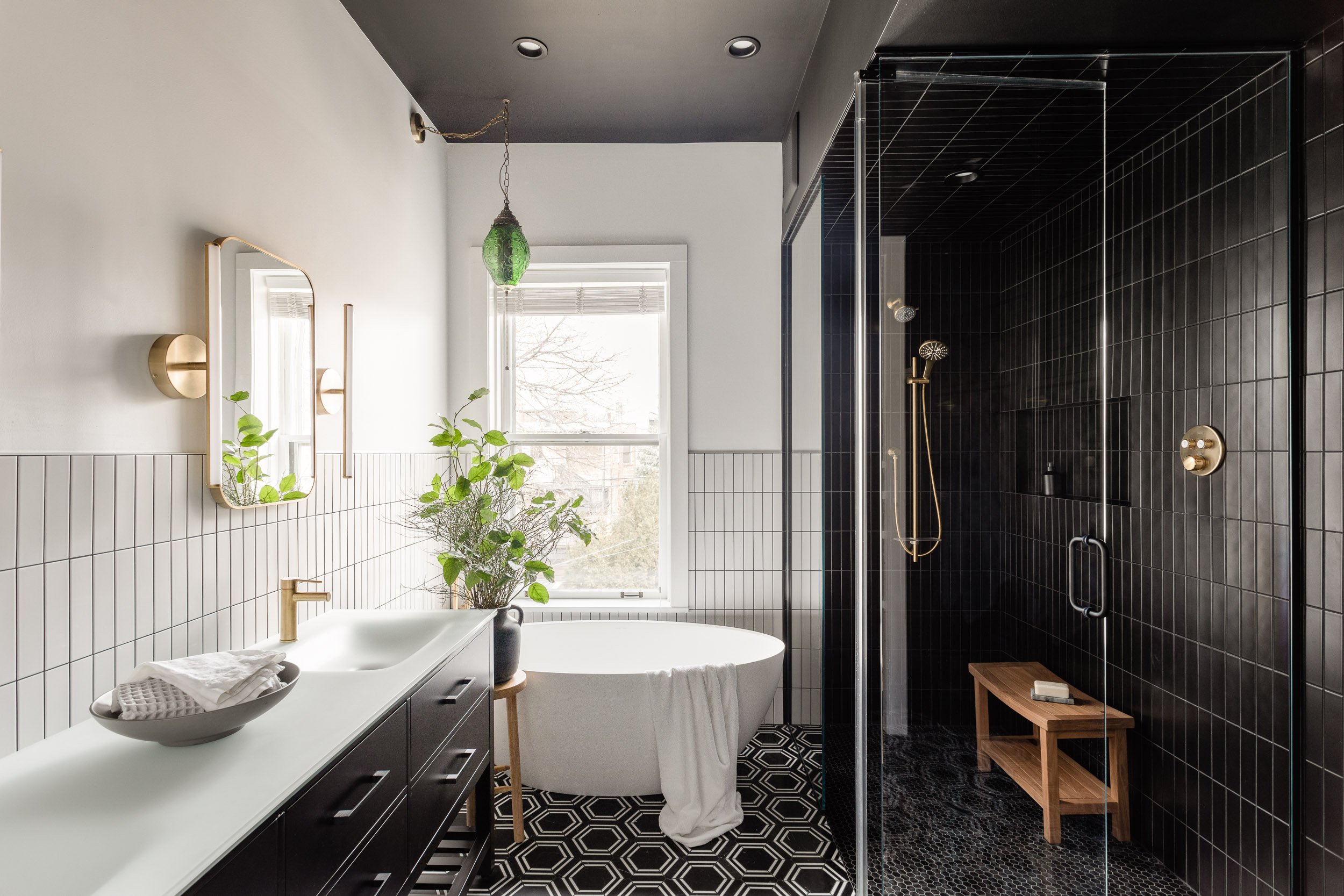 In contrast, the master bathroom is the tucked away relaxation spa to unwind. Heated floors, custom slumped glass sinks and high contrast tile create a comfortable yet clean design.